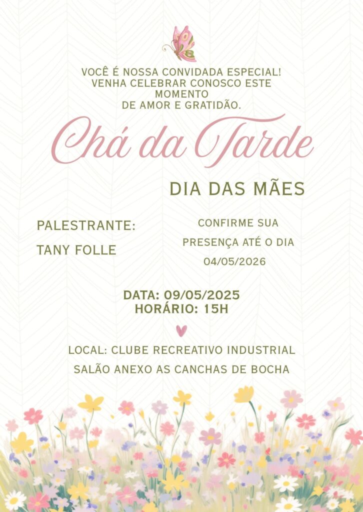 Será uma tarde agradável, com um delicioso chá, boa companhia e uma inspiradora palestra preparada especialmente para homenagear todas as mães.